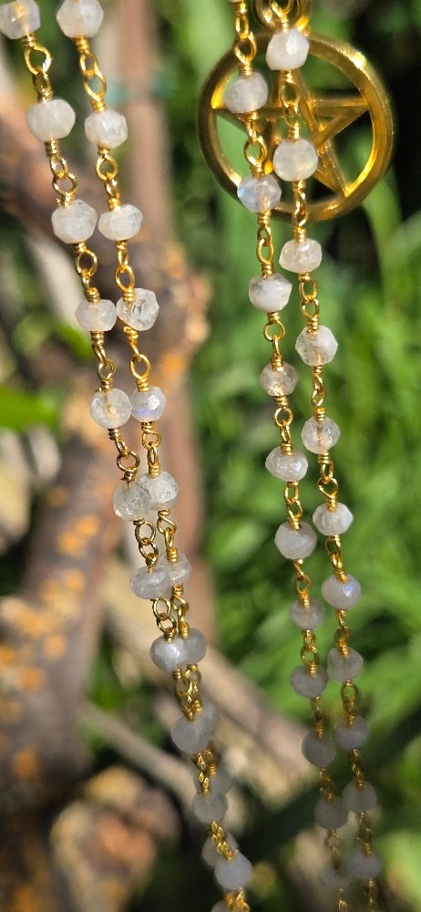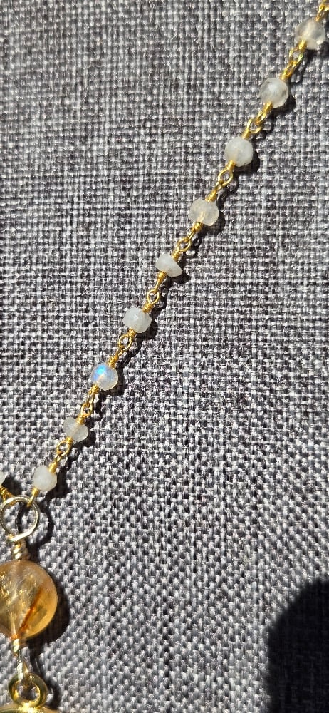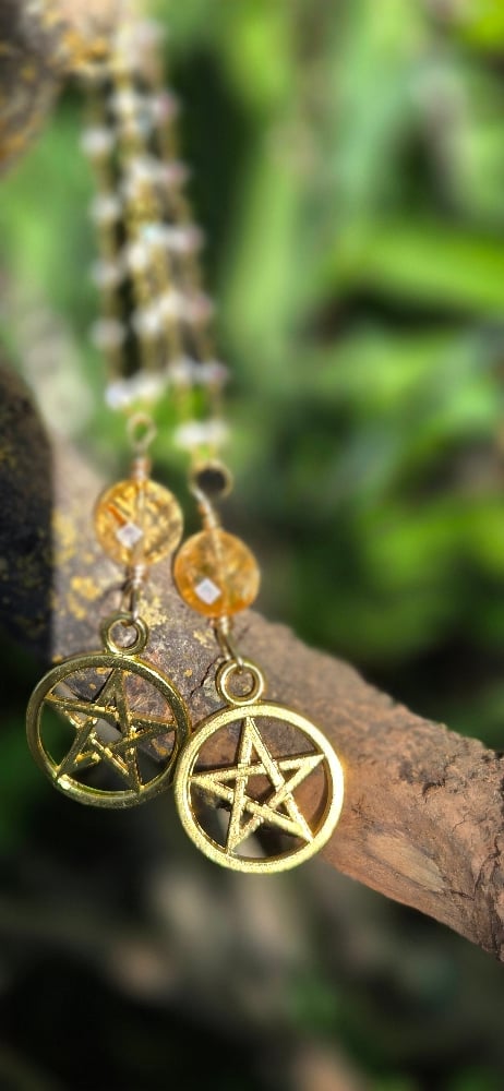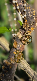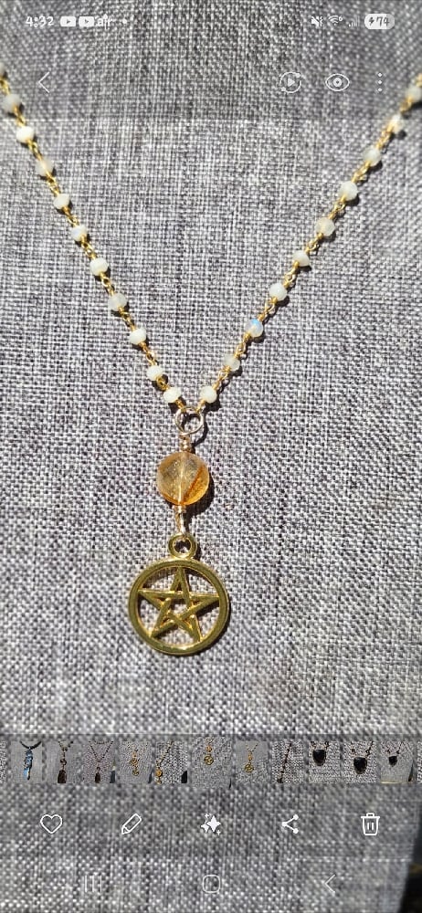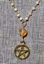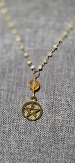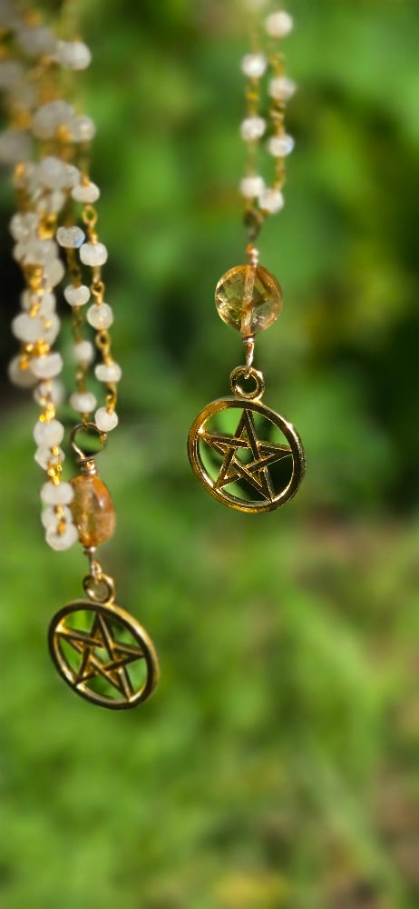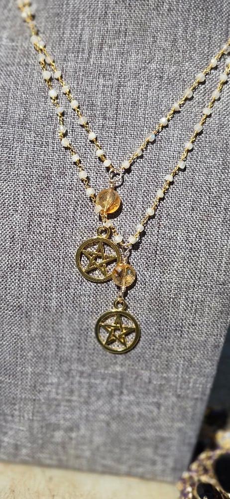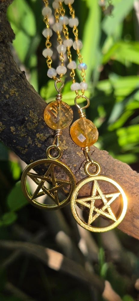 The Sun and Moon Pentacle is a magical piece indeed. A gold tone Pentacle topped with a gorgeous Citrine coin and hangs on a Moonstone chain. Citrine Boosts Confidence: Encourages self-esteem, willpower, and personal power.
