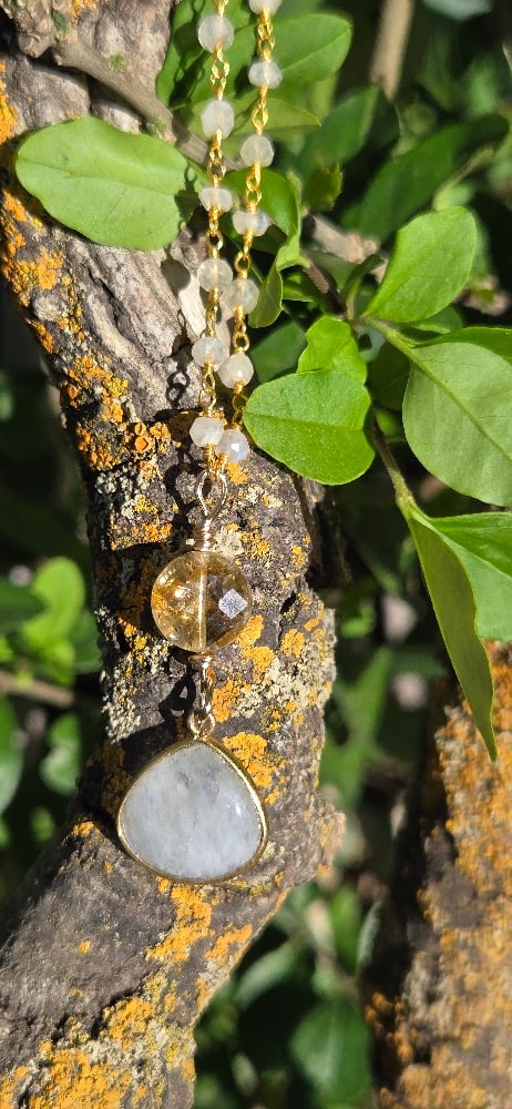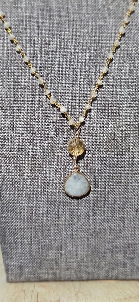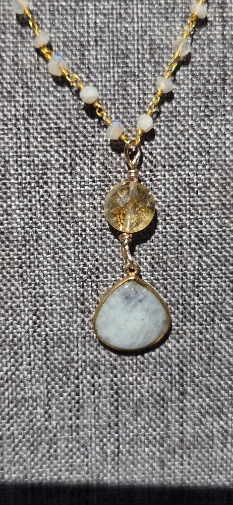 This bright and beautiful necklace glows with light! It is the Sun and the Moon in necklace form. It is comprised of a Moonstone pendant with a gorgeous Citrine coin and hangs from a Moonstone chain. It hangs 13 inches, including the pendant.